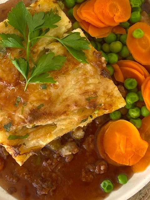 Pastel de carne con puré cremoso y guisantes