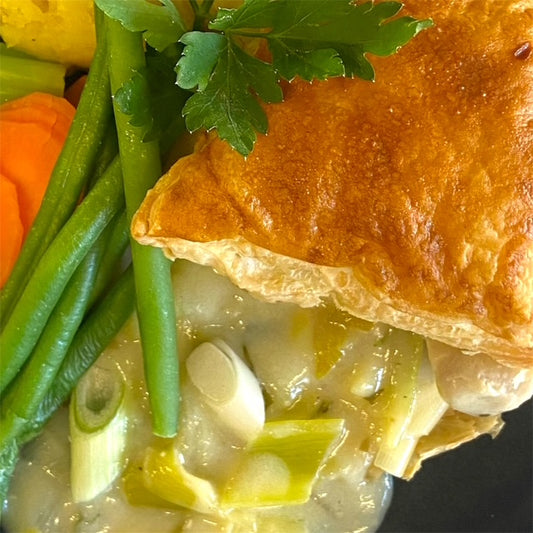 Pastel de carne y cerveza con verduras y puré cremoso