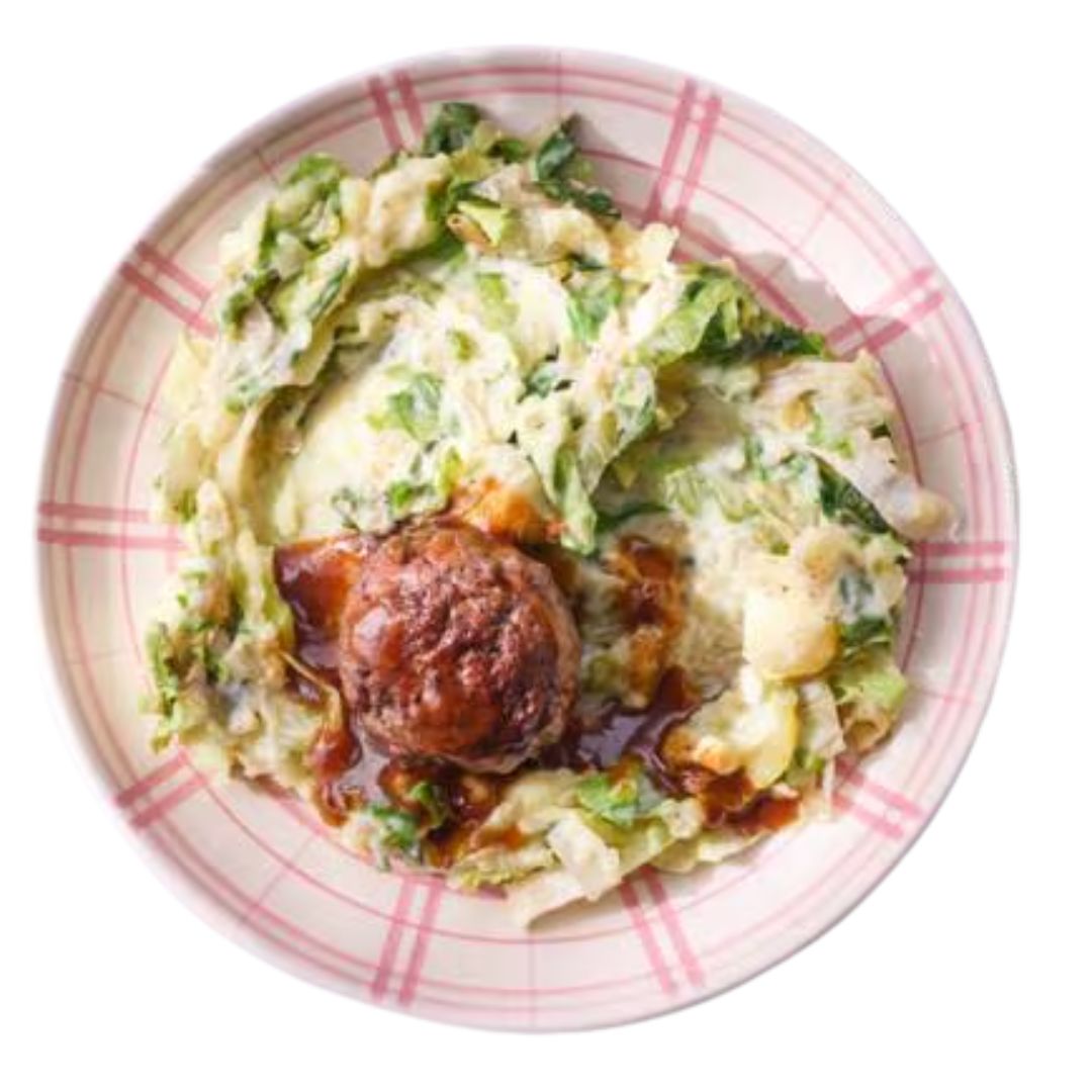 Een echte Hollandse comfortklassieker. Romige aardappelpuree gemengd met verse andijvie, een royale portie knapperige spekjes en een rijke jus. Geserveerd met een ouderwetse oma-gehaktbal voor die authentieke, huiselijke smaak.