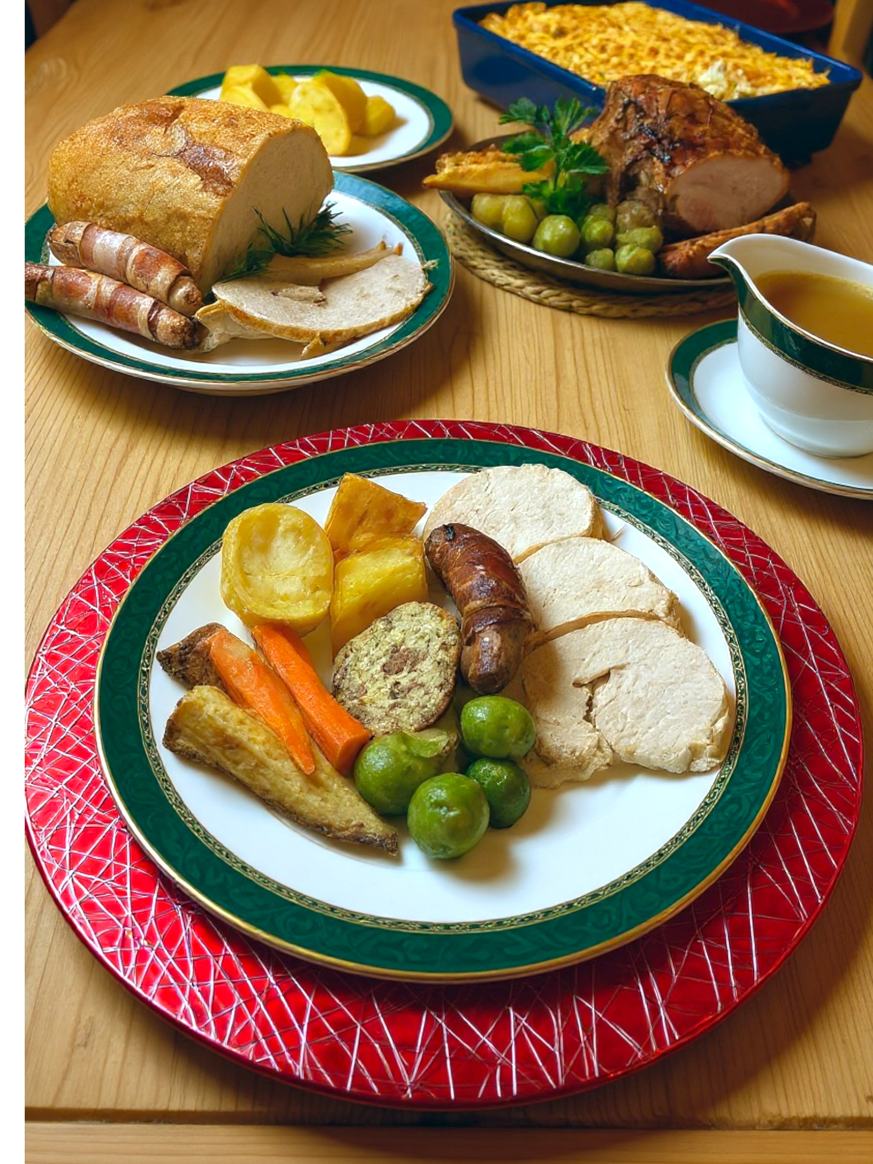 Dit feestelijke kerstmenu omvat ook: Geroosterde aardappelen, cranberryvulling, pigs in blankets, geroosterde wortelgroenten, spruitjes, gemengde groenten en jus